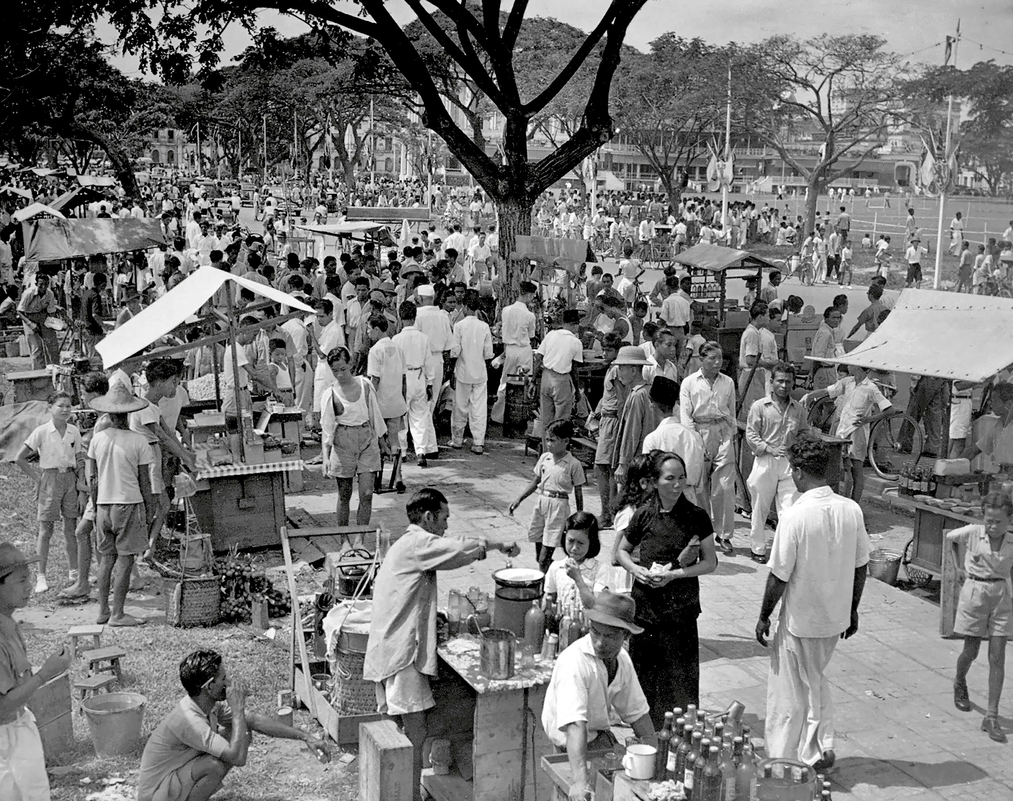 Feeding the Hungry: Hawker stalls sprang up overnight as thousands of holidaymakers thronged Connaught Drive and the Padang for a fly-past and motorcycle display celebrating the royal wedding of Princess Elizabeth and Lieutenant Philip Mountbatten on Nov 20, 1947.