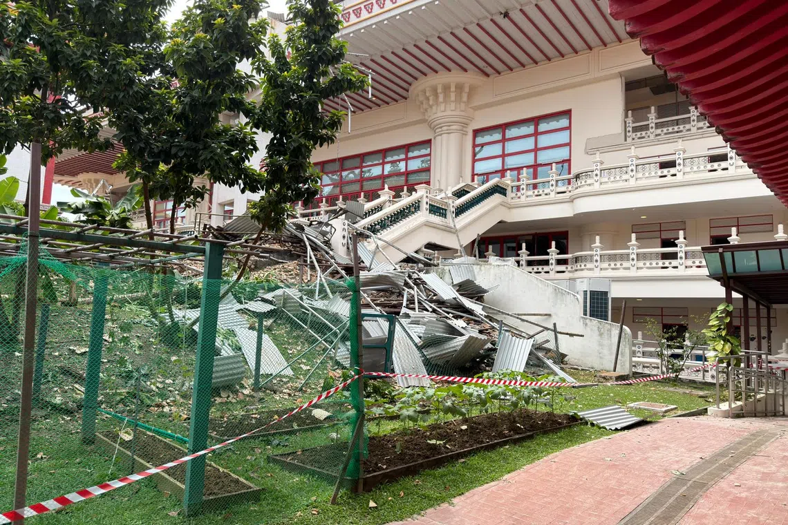 SINGAPORE – Two buildings at the Kong Meng San Phor Kark See Monastery have been closed off from public access after sections of the roof tiles and the supporting roof frame of one of the buildings fell off on Nov 26.