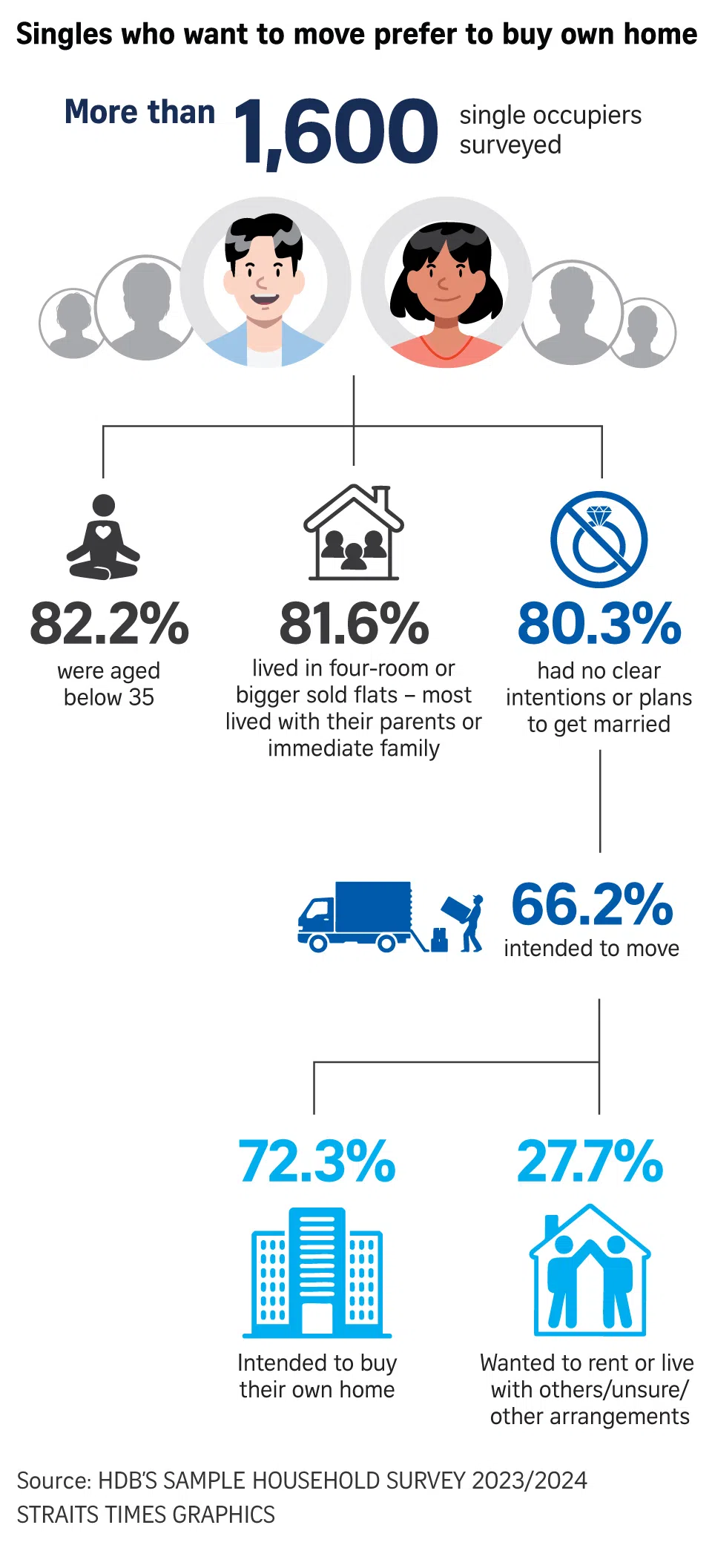 The report, which aimed to better understand the potential housing choices of singles, found that 80.3 per cent of singles surveyed did not have clear plans to get married. In this group, more than six in 10, or 66.2 per cent, wanted to move out of their current home.