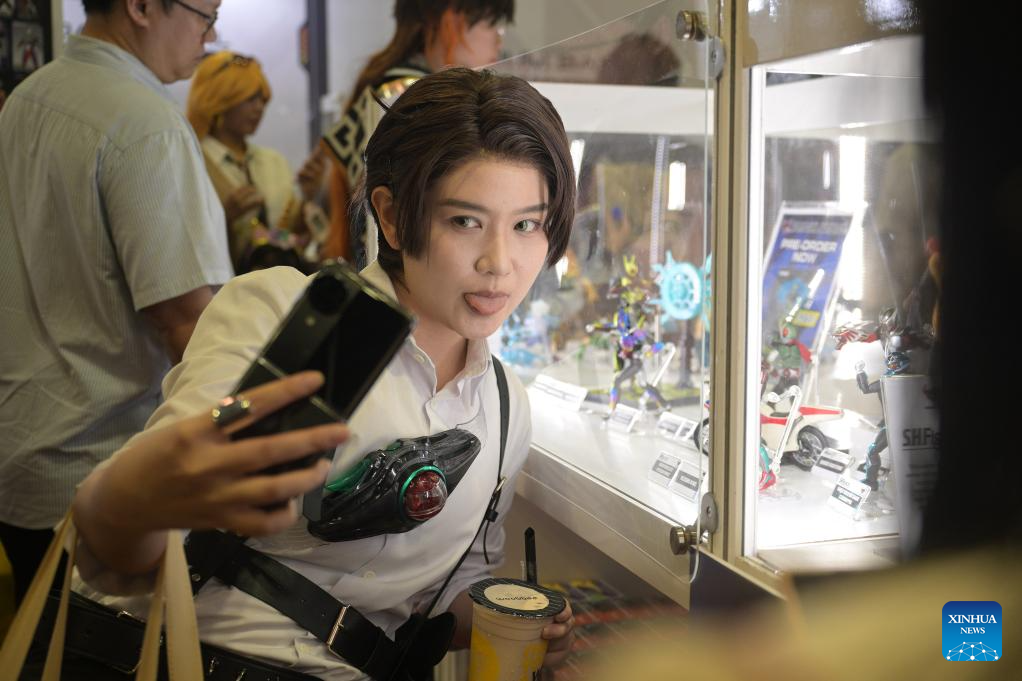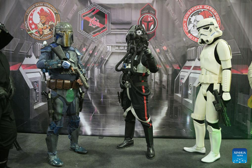 A dressed-up cosplayer poses for selfies during the Singapore Comic Con in Singapore on Dec. 6, 2025. The event opened here on Saturday. (Photo by Then Chih Wey/Xinhua)