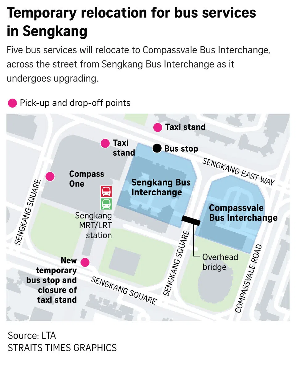 SINGAPORE – From Jan 31 to the end of October 2026, five bus services at Sengkang Bus Interchange will move across the road to Compassvale Bus Interchange so upgrading works can be carried out at the former.