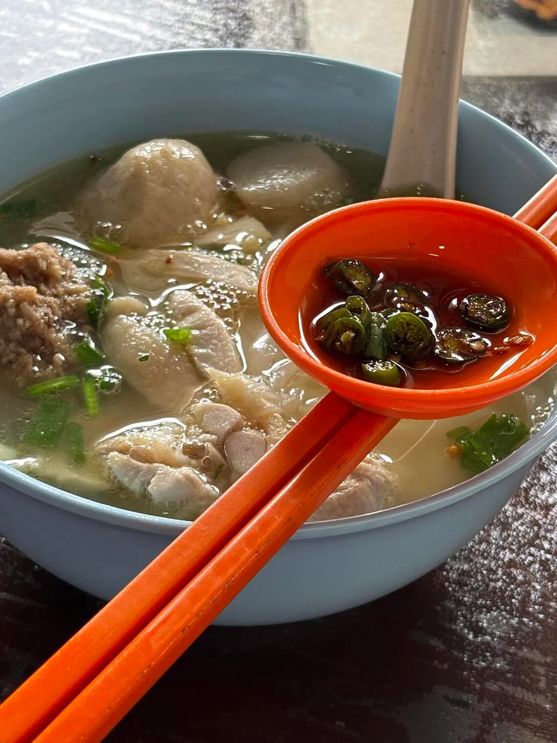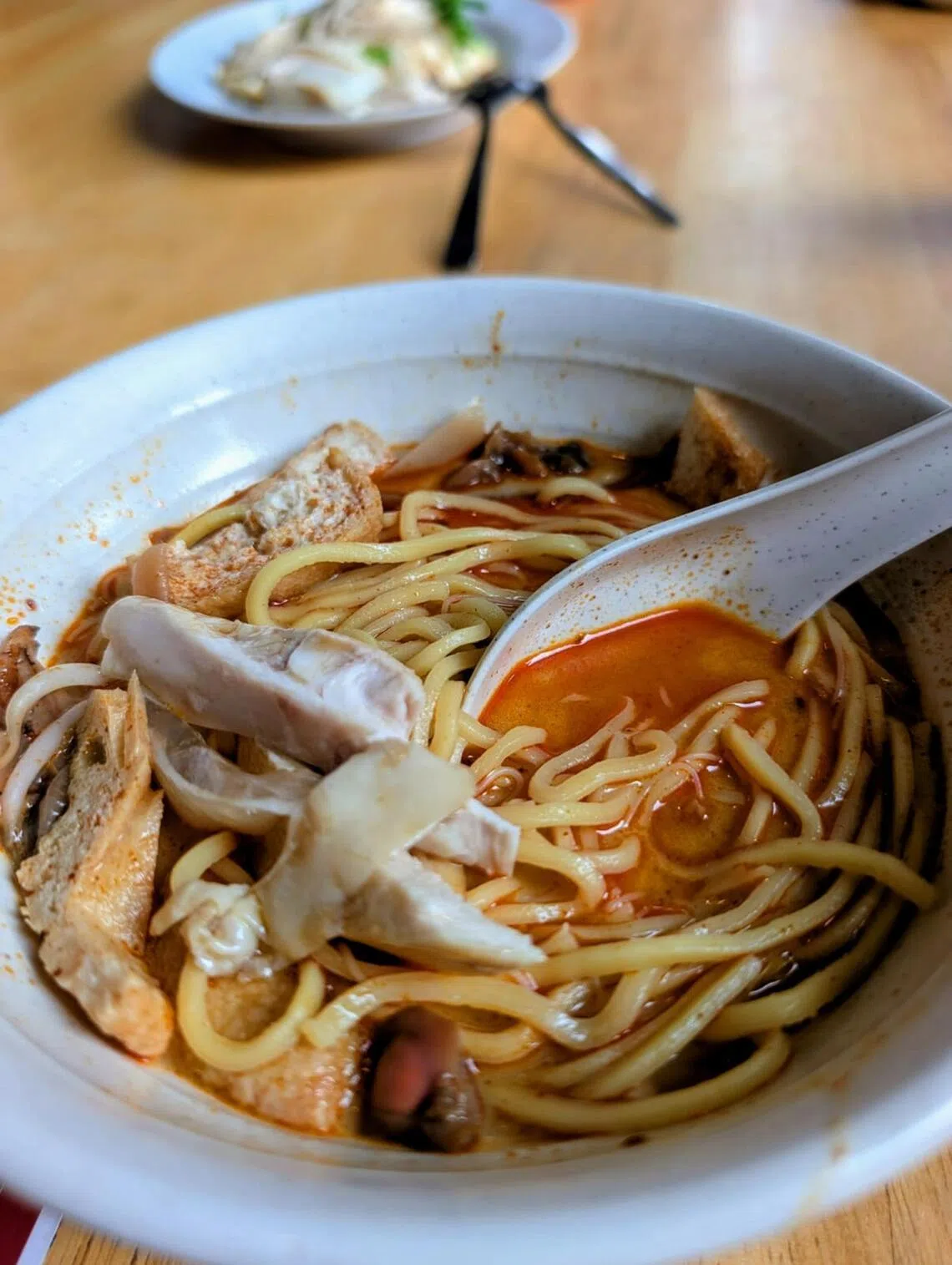The bee hoon holds its bite without being soggy. The deep red broth comes topped with chunks of pork, dried prawns and shallots.