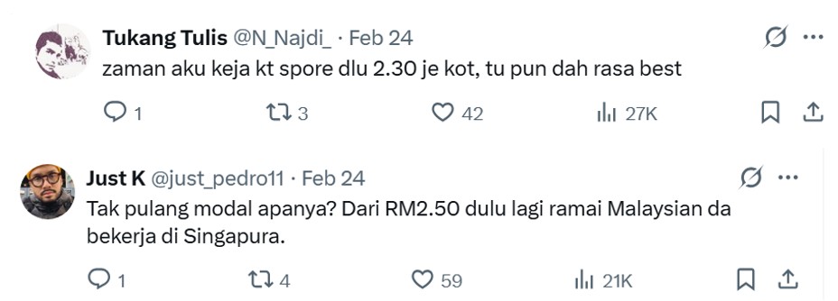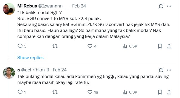 One commenter expressed surprise that the poster felt that exchange rate was unfavourable to Malaysians working in Singapore.