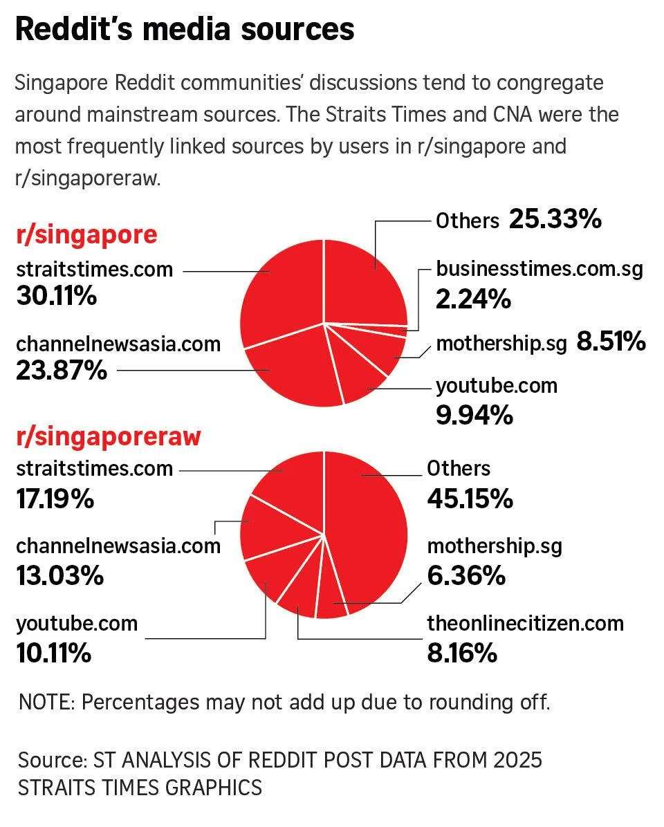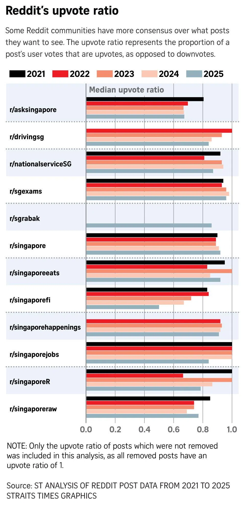 To understand how Singapore’s Reddit users ferret out information and shape discussions, The Straits Times analysed user engagement patterns across 12 of Singapore’s most-frequented subreddits (which the platform calls its subforums) from 2021 to 2025.