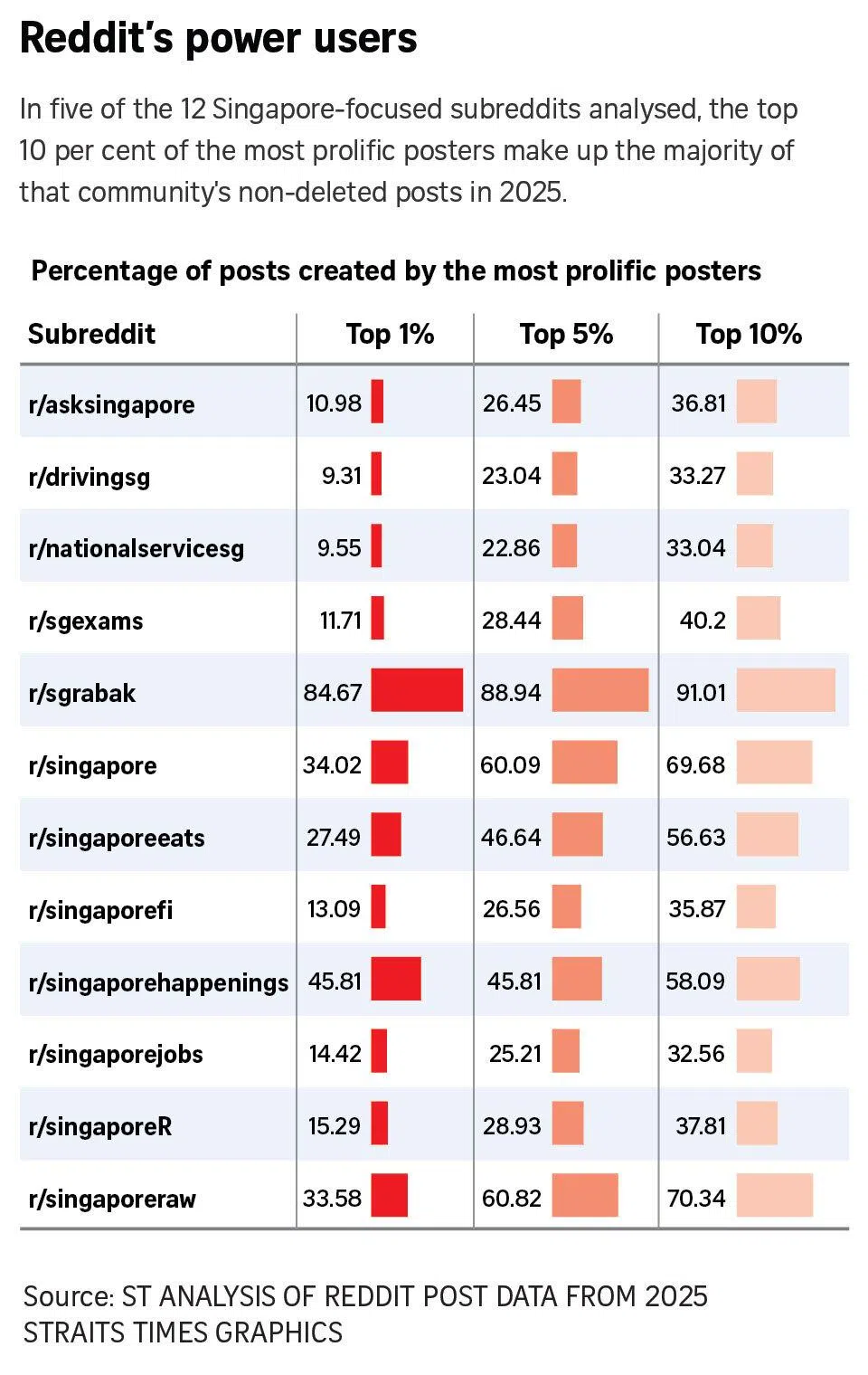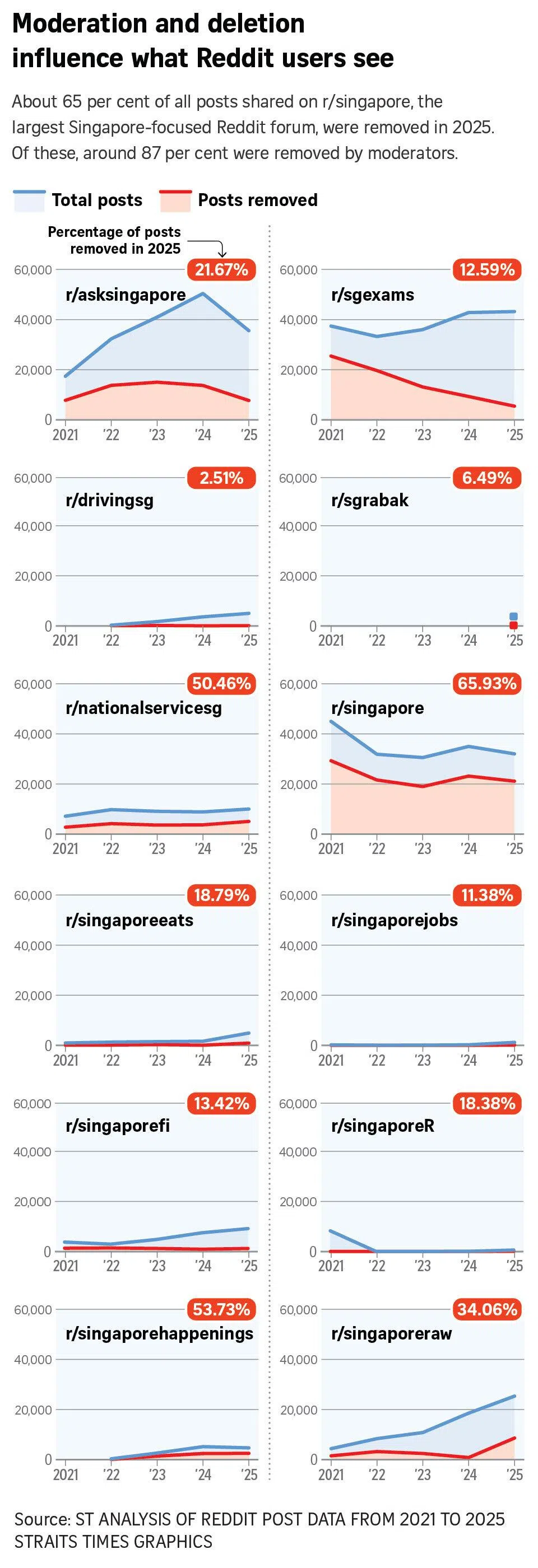 Yet, more than half (57 per cent) of the over 30,000 posts created by users on r/singapore in 2025 were deleted by the subreddit’s moderators. This was the highest rate of removal of the 12 local subreddits analysed.