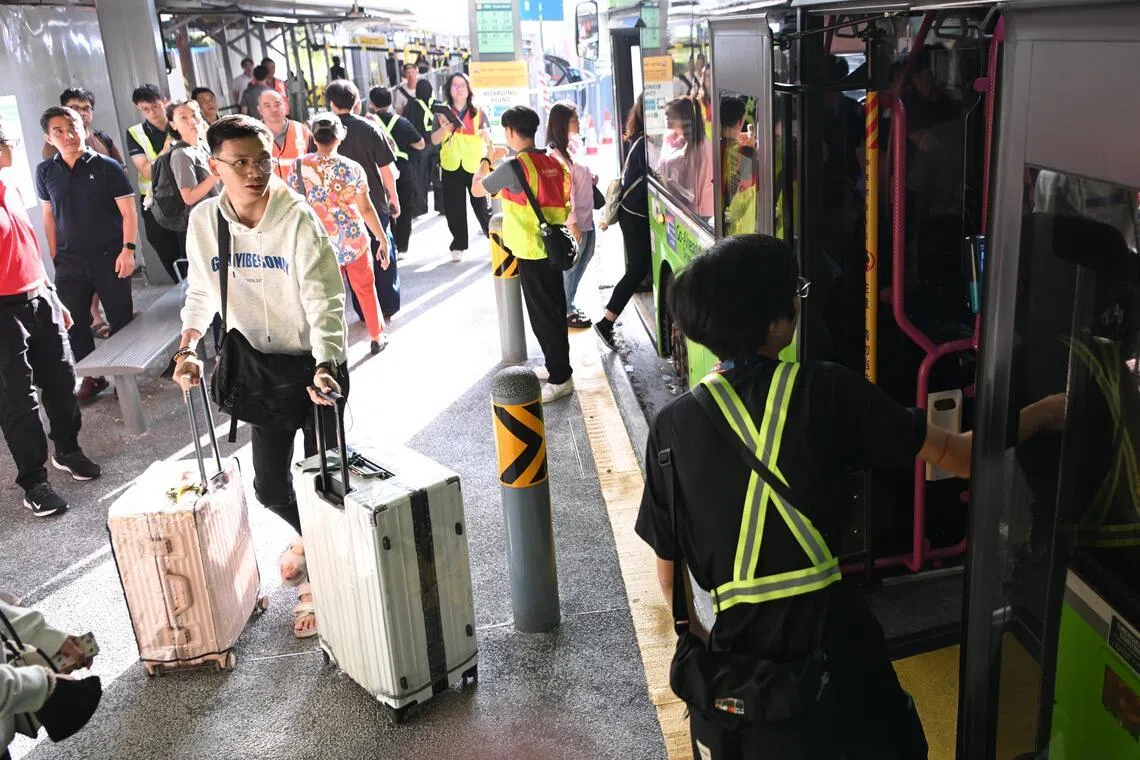 Crowd marshals were on standby at train platforms and MRT gantries, as well as at the bus stops served by the shuttle service, to actively broadcast directions on portable microphones, guide passengers with light batons and assist those with questions.
