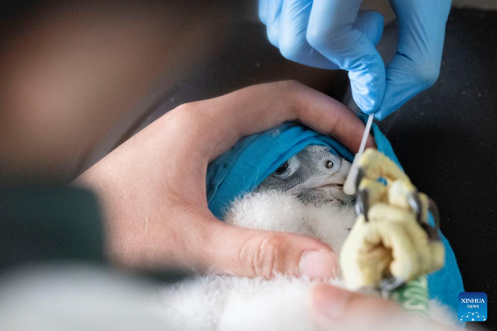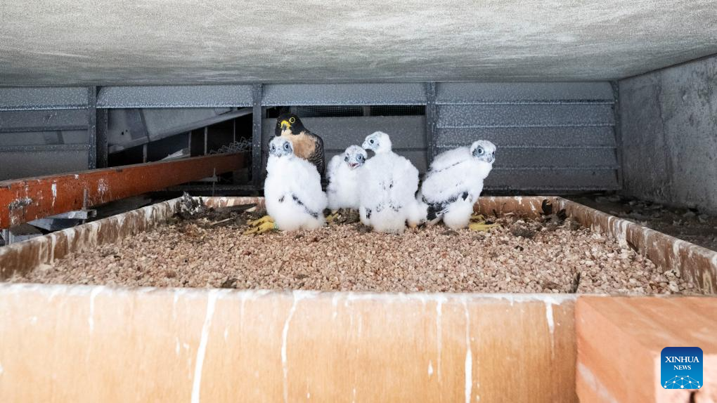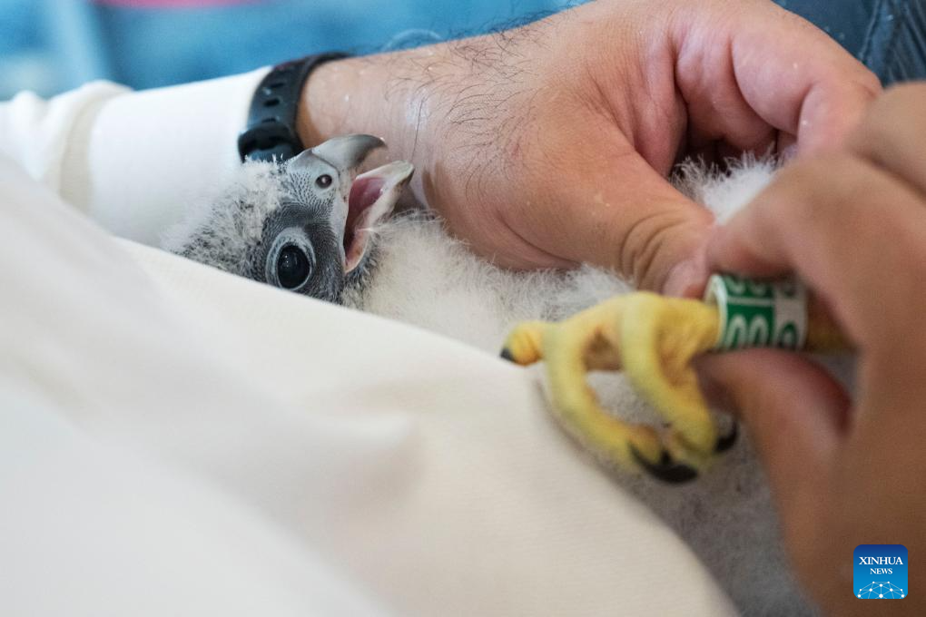 A staff member of Singapore’s National Parks Board (NParks) puts a ring tag on a foot of a peregrine falcon chick during a tagging and data collection operation at the OCBC Center in Singapore, March 14, 2026. Singapore’s NParks staff fitted ring tags on four peregrine falcon chicks at the downtown OCBC Center on Saturday to track their movements, lifespan, and breeding patterns. (Photo by Then Chih Wey/Xinhua)