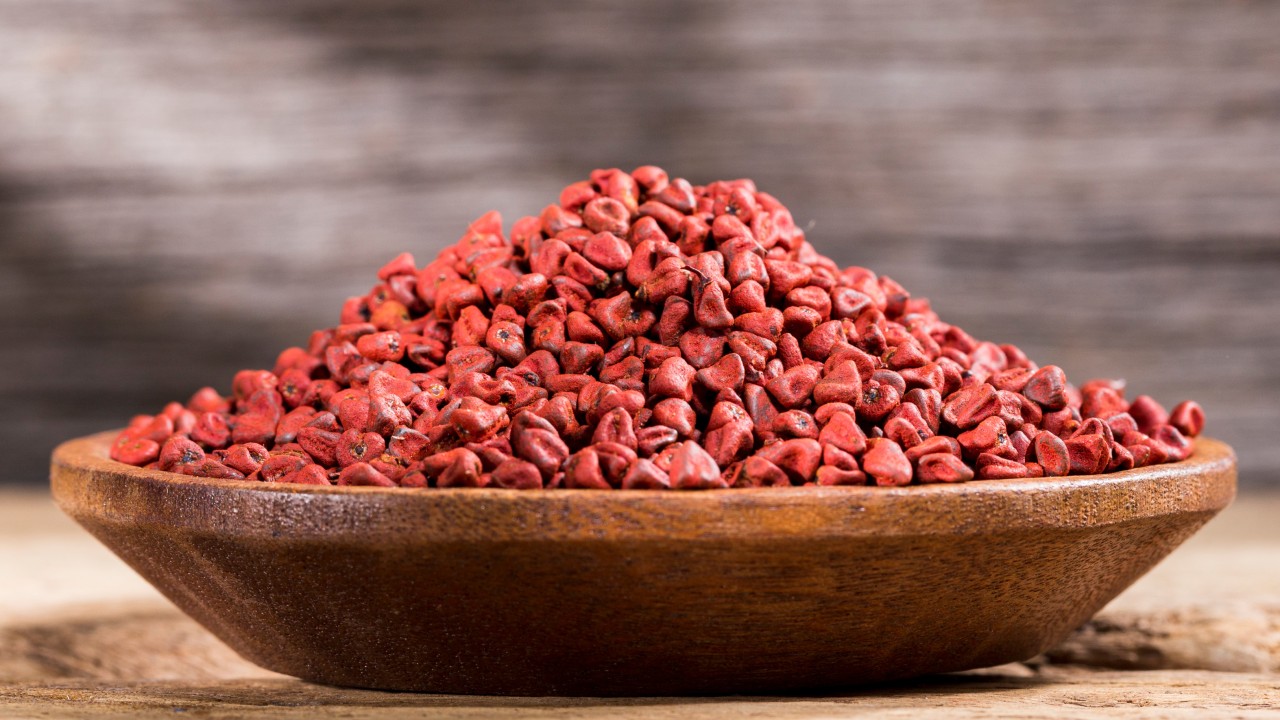 Annatto, also known as achiote, is a spice known more for its colour than its flavour. The seeds of the annatto tree are dried into hard reddish-brown pellets, which are used as a natural dye (including for lipstick, hence it is also called “the lipstick tree”) and food colouring. The shades range from golden yellow to deep red, depending on the concentration.