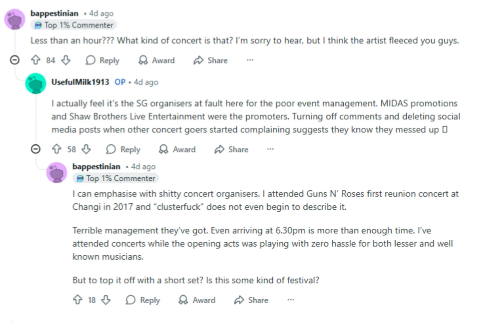 Multiple attendees claimed they queued for up to two hours just to enter the venue — only to miss a significant portion of the show. One fan shared that despite arriving at 6:30PM, they only got in around 8:20PM, by which time the main set had already begun. The performance reportedly ended around 8:50PM, leaving many fans with just 30 minutes of the headline act.