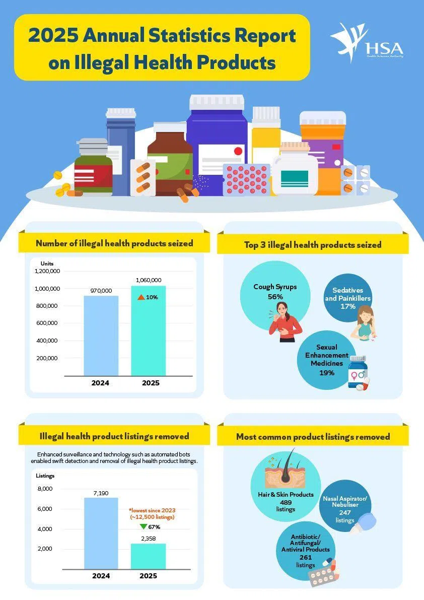 SINGAPORE – More than 1.06 million units of illegal health products worth over $750,000 were seized in 2025, an increase of around 10 per cent from the previous year, said the Health Sciences Authority (HSA) on March 24.