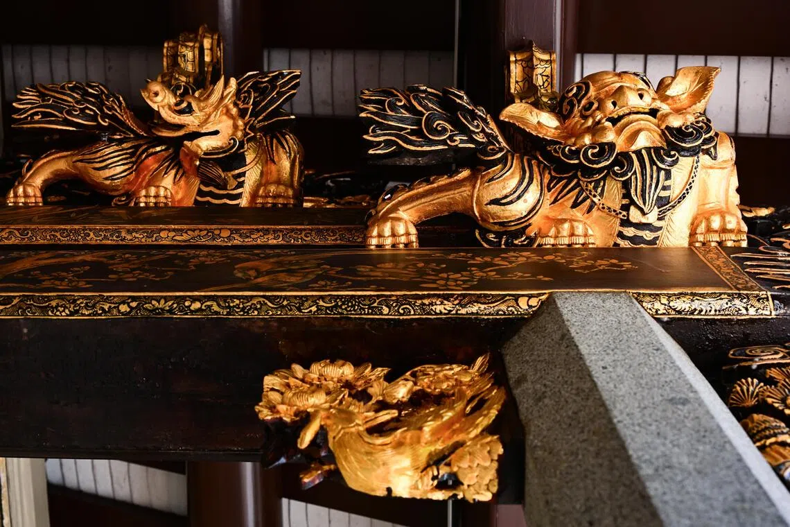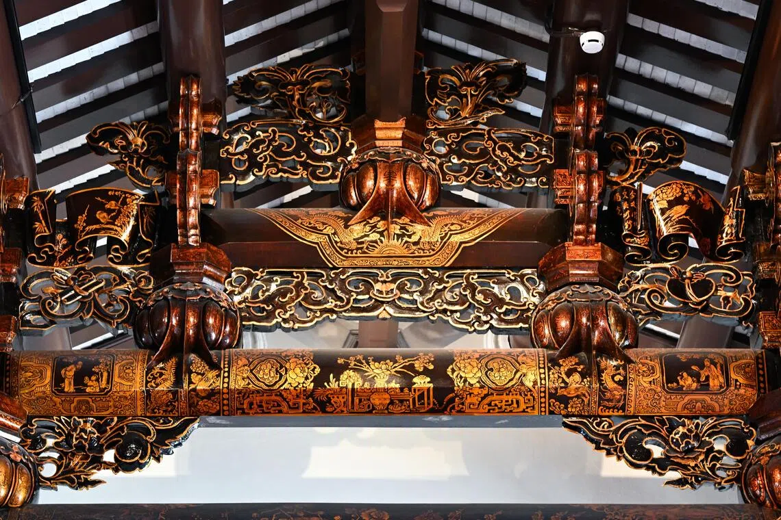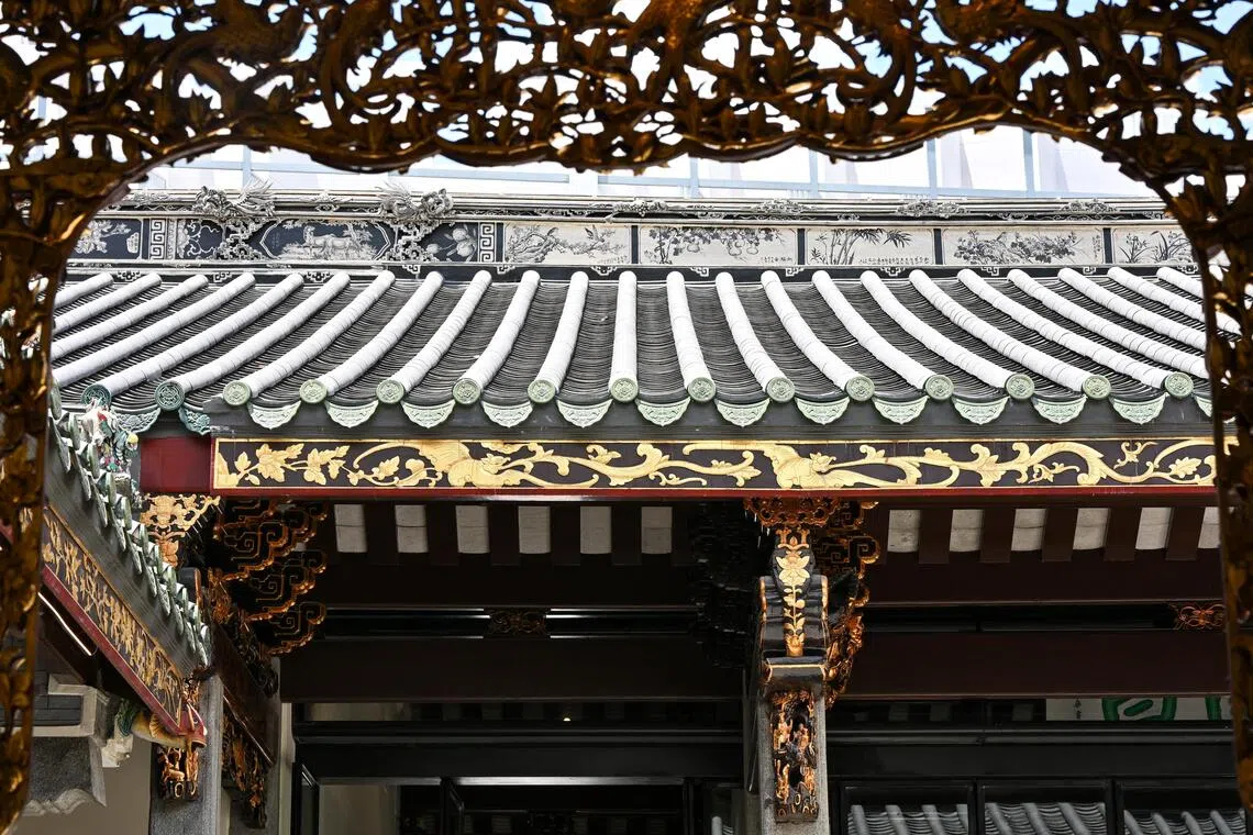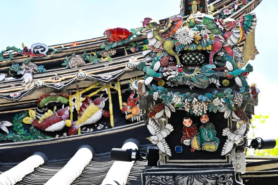 A hallmark of Teochew design can be seen on the roof ridges, which feature intricate timber carvings, plaster reliefs and porcelain figurines created through a decorative process called “qianci”.