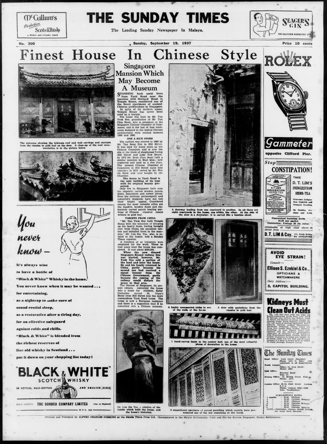A clipping of a 1937 article on the House of Tan Yeok Nee in The Straits Times.