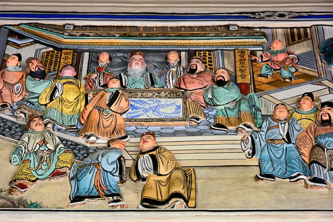 Skilled artisans, mainly from Chaozhou, use shards made from fired bowls to create mosaic patterns and classical Chinese figures on roof ridges and bas-reliefs on walls to depict Chinese people’s aspirations through richly ornamented surfaces.