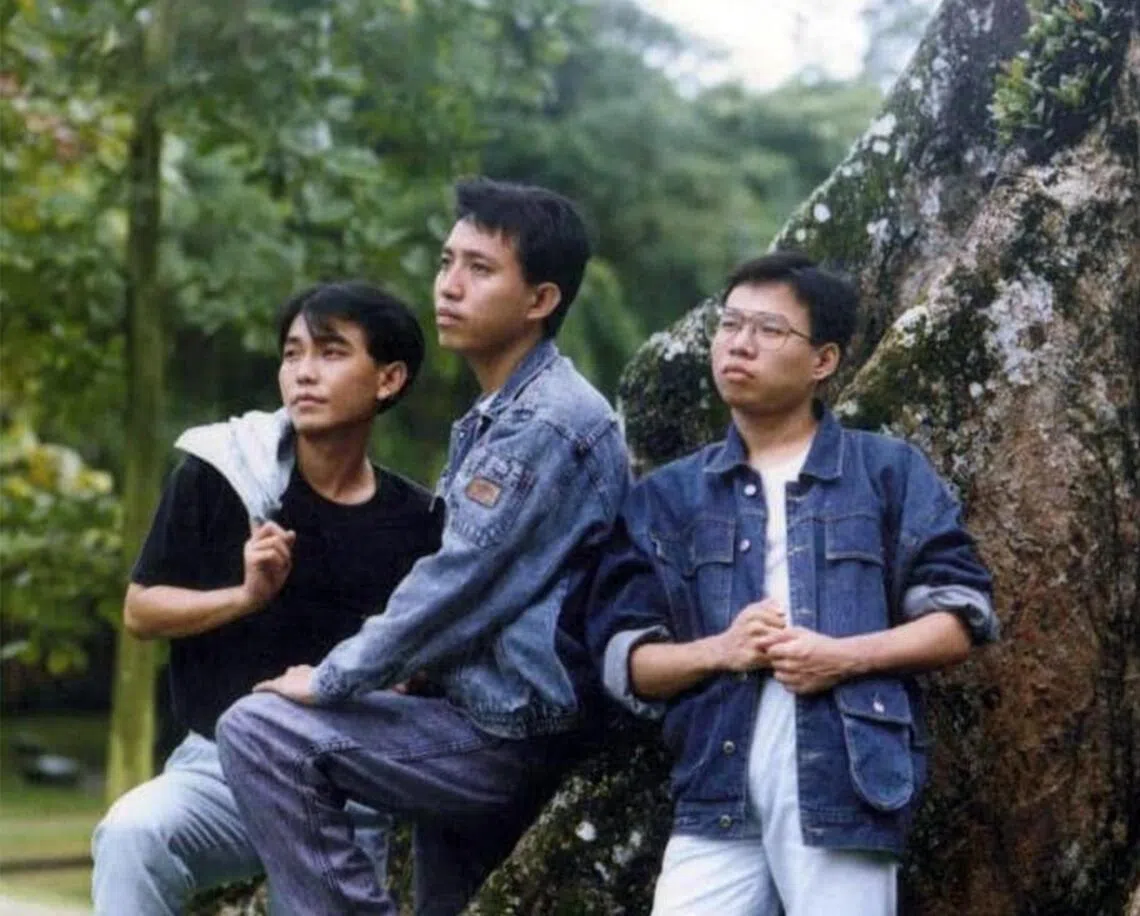 Mr Cai Yiren (centre) with his xinyao group “The Rhythm” in 1990.