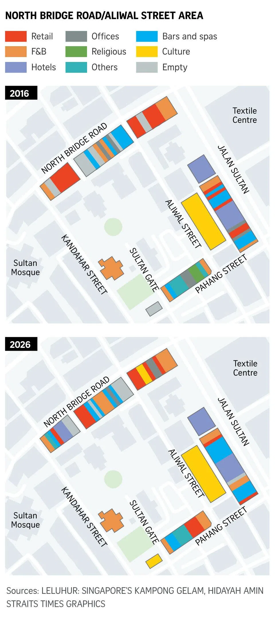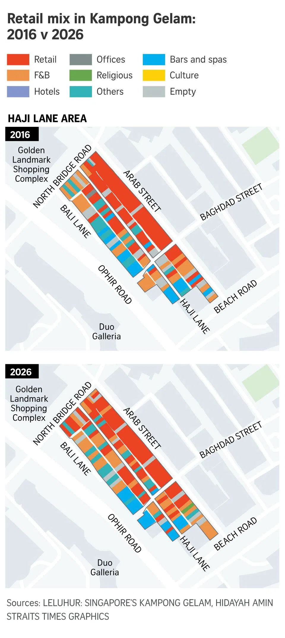When The Straits Times visited 228 buildings around Aliwal Street, Haji Lane and North Bridge Road, it found that compared with 10 years ago, food and beverage outlets had risen from about 17 per cent of shops to comprise nearly a quarter.