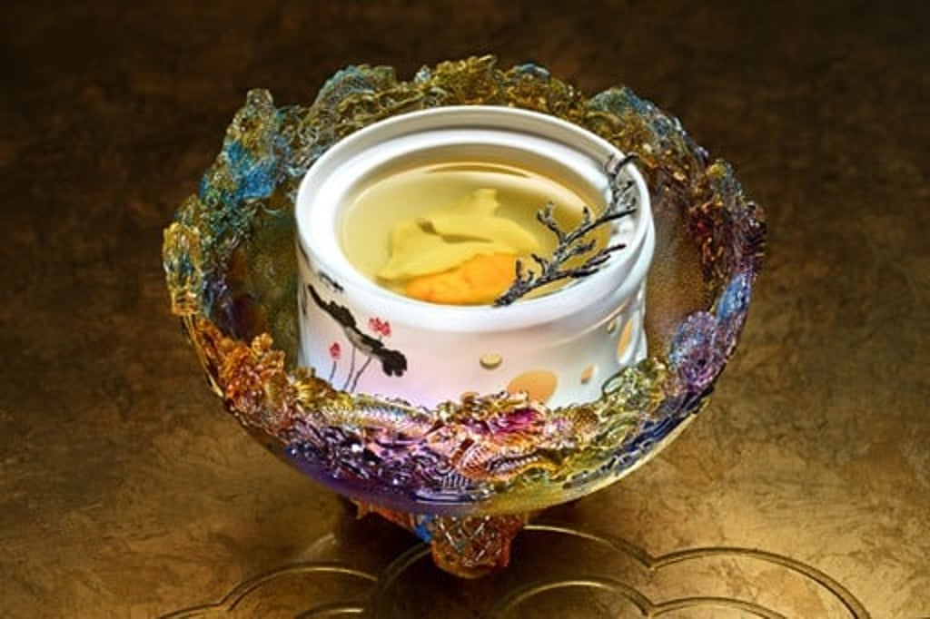 As soon as you arrive at Imperial Court, located in a dedicated corner of MGM MACAU’s VIP lobby, your eyes are inevitably drawn to the striking dragon-carved marble column twisting skyward. A symbol of power, fortune and imperial grandeur, this centerpiece sets the tone for an immersive dining experience in a fine-dining institution where Lingnan Guangfu cuisine meets modern culinary artistry. The restaurant is designed to resemble an elegant garden with towering emerald-toned walls and a gold-leaf ceiling. Inside, guests are greeted by captivating floral arrangements that exude refined opulence. Every table in the sleek, contemporary dining room features Liuli tableware, from chopstick rests to napkin rings — a nod to the elegance of ancient Chinese craftsmanship. For those seeking a more intimate setting, there are six private dining rooms offering discreet seclusion, each decorated in a distinct color palette with refined detailing.