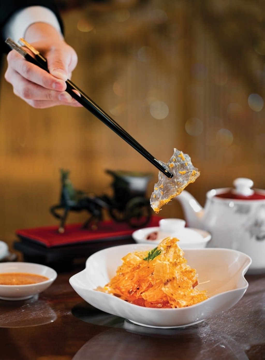 Another staple dish, Crispy Mullet Carpaccio with Sichuan Peppercorn Sauce, is inspired by the classic Sichuan “shadow beef”. Chef Yang, reinvents the tradition with thin slices of fresh blackfish that are marinated, air-dried and fried to a translucent perfection. They are then tossed with sugar, vinegar and a special red oil. The result is a beautiful cold dish that strikes a balance between heritage and innovation.