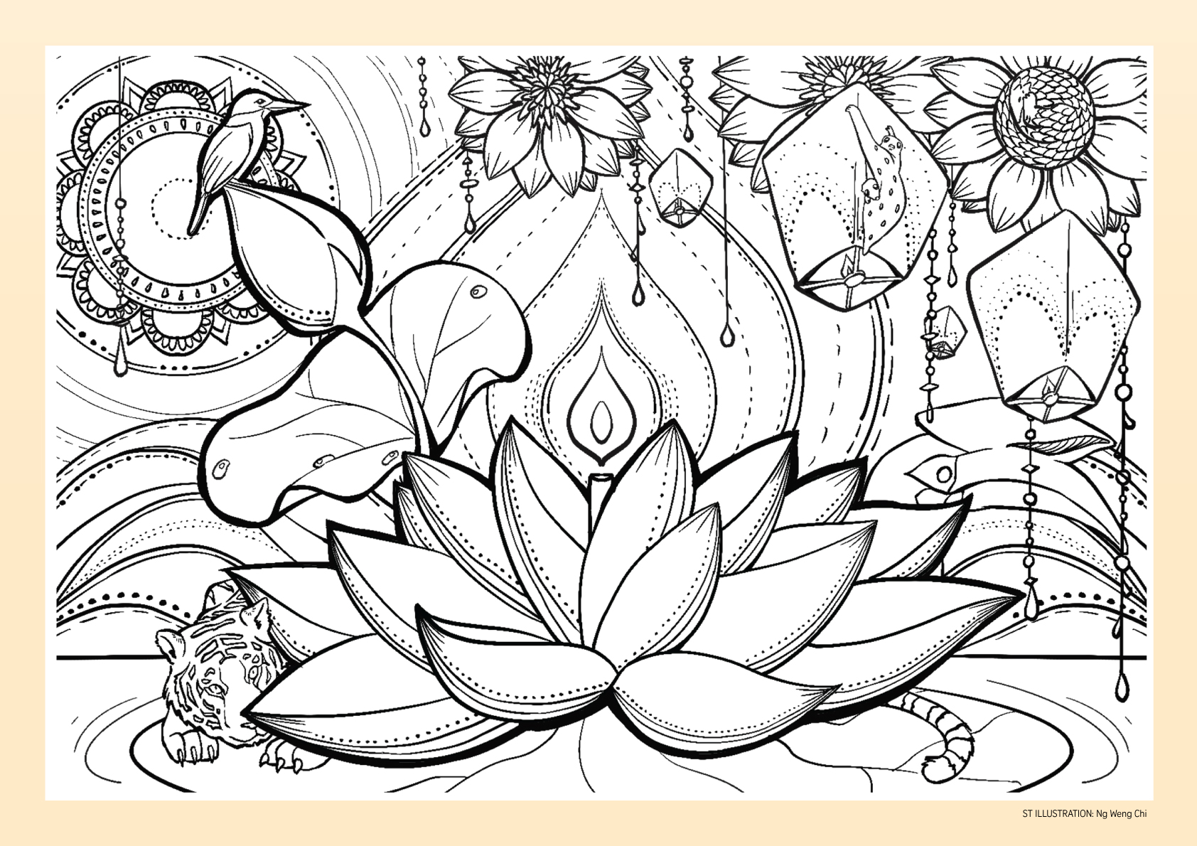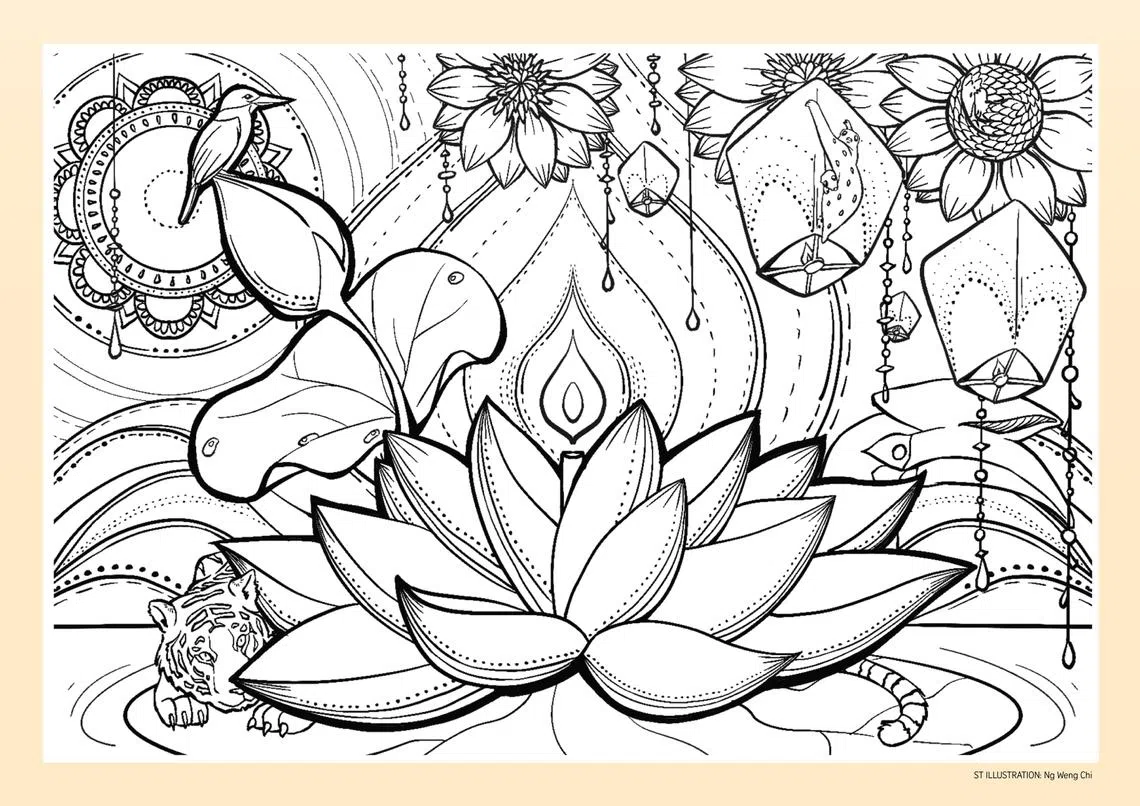 The full-page spread also features a lotus-themed colouring artwork and a word search puzzle.