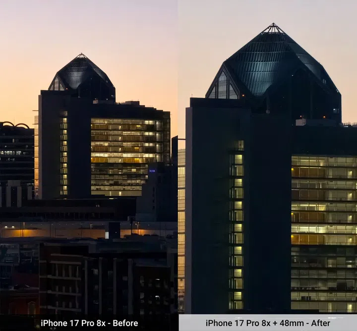 The lens itself is rated at 48mm (35mm equivalent), and attaching it to an iPhone 17 Pro model gets it up to 16x magnification at 384mm (instead of the default 200mm at 8x optical-quality zoom).