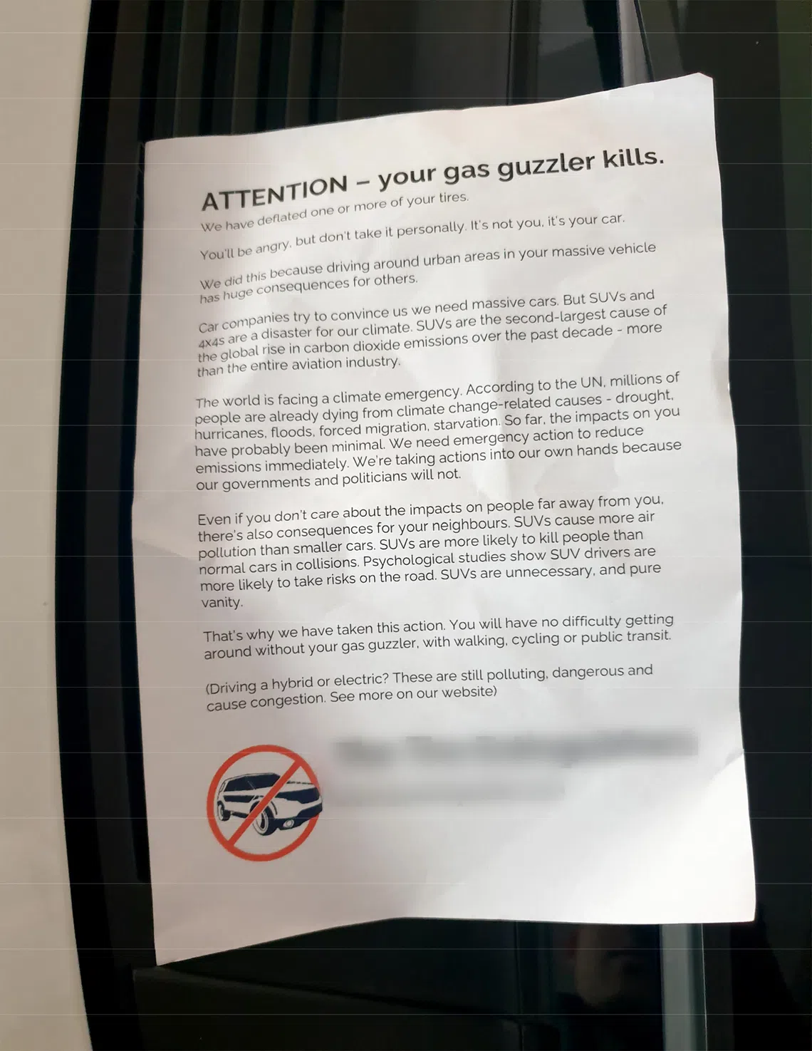 He thus decided to deflate the tyres of cars parked near his house and to leave fliers on the environmental damage caused by SUVs on these cars.